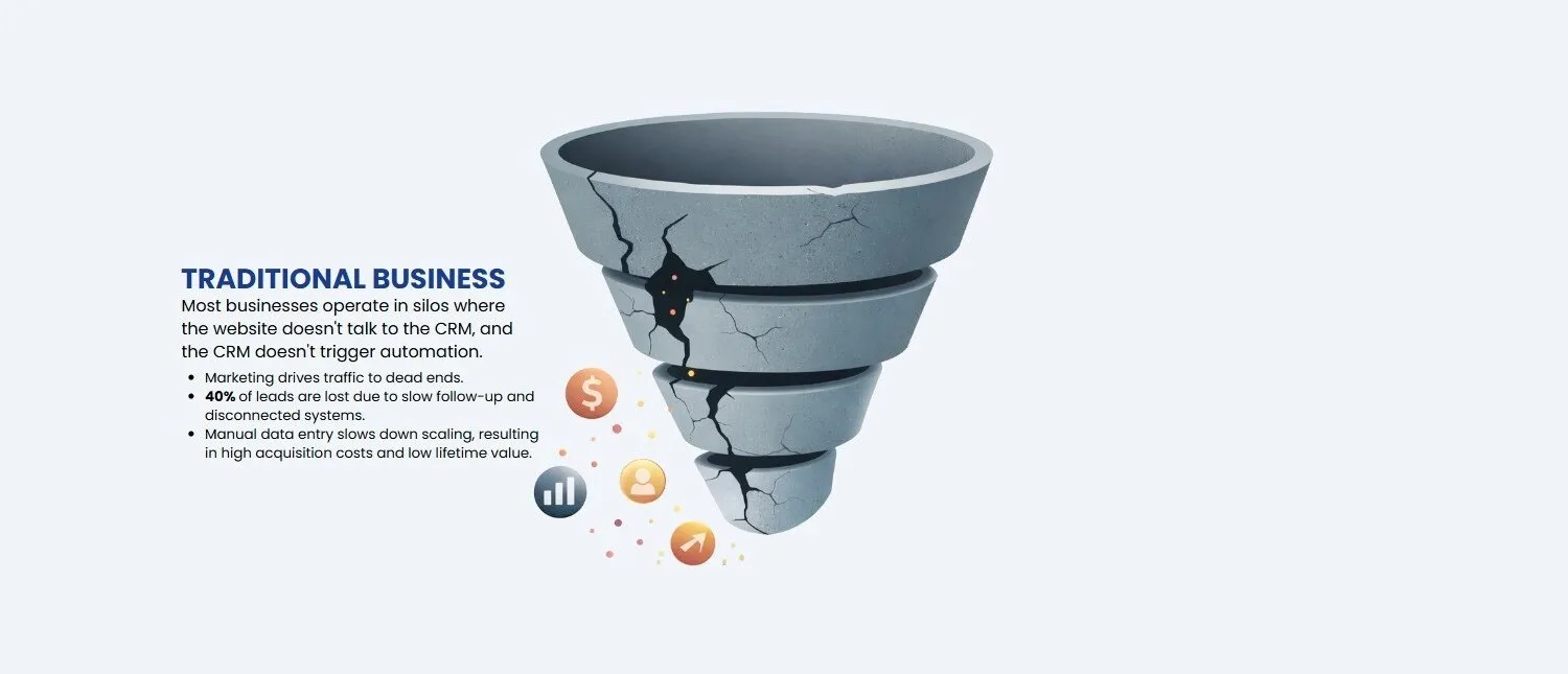 Most businesses operate in silos where the website doesn’t talk to the CRM, and the CRM doesn’t trigger automation.